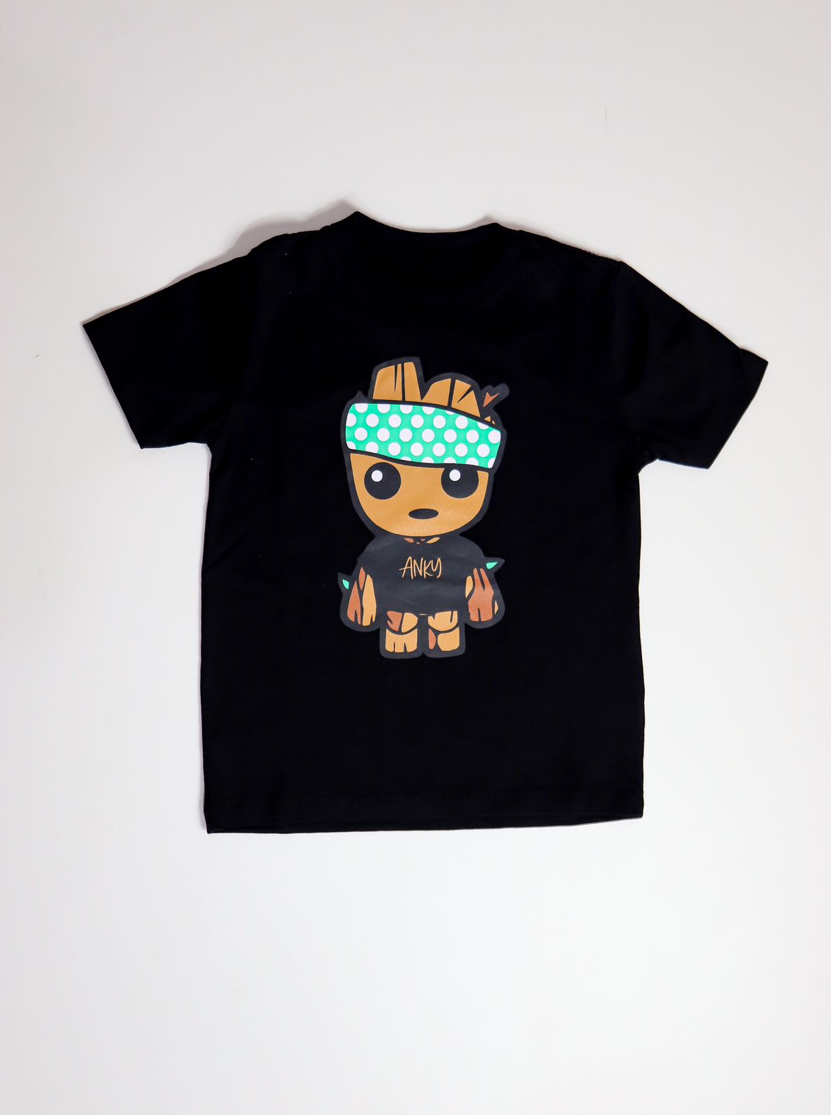 Estampa do baby groot para crianças de 2 a 14 anos. Disponível nas cores azul, verde, bege, preta, branca e cinza.